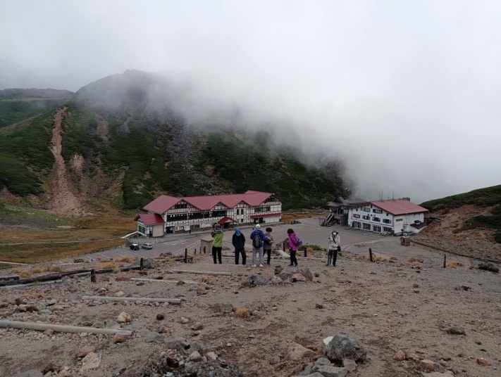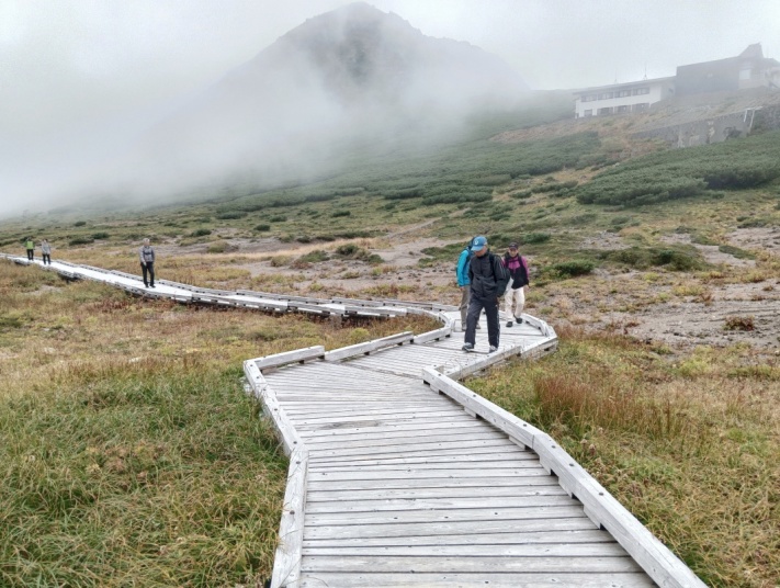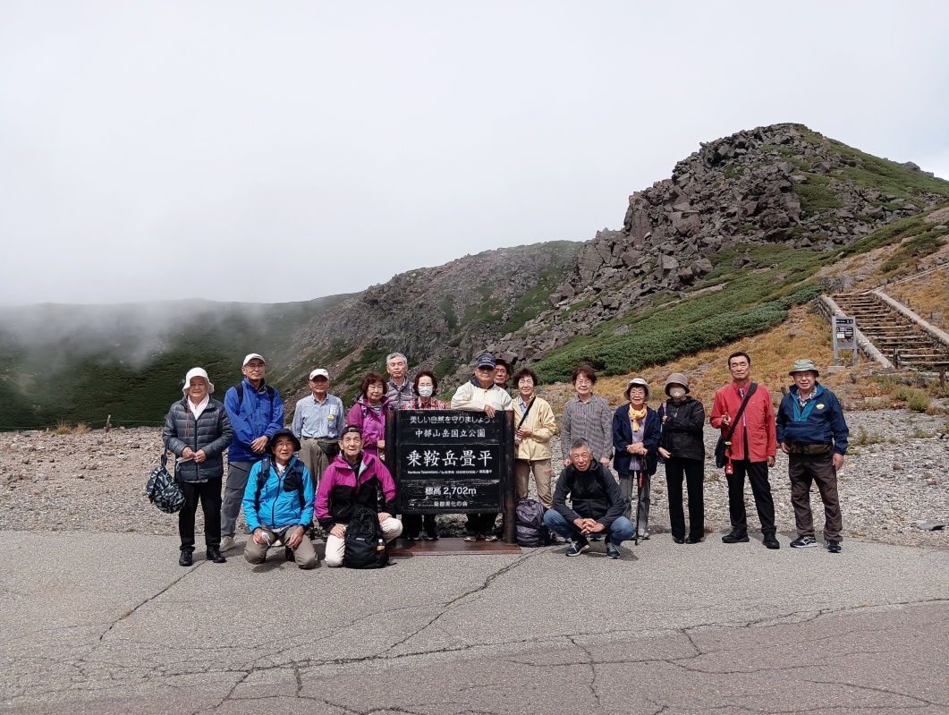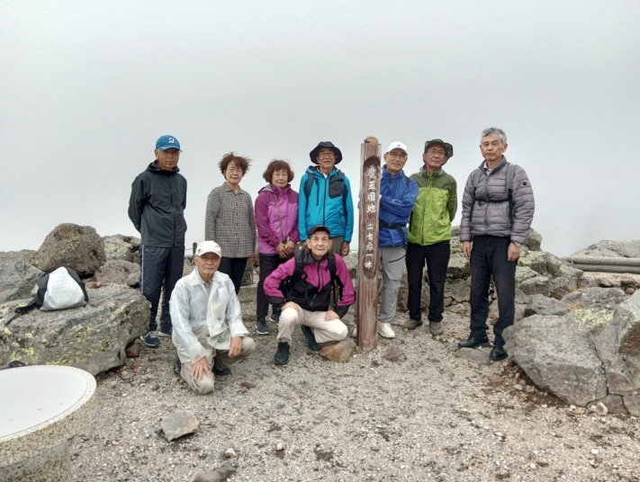 久しぶり(6年振り)のネットひまわりと歩こう会のメンバーを加えた日帰り旅行でした。 心配していた雨ですが、朝方は小雨がパラパラ・・・でしたが、暫くすると小康状態・・・昼食会場のとろろ飯で有名な 「茶茶」に着く頃はスッカリ雨も上がり、目的地の畳平ではガスこそ出ていましたが、晴れ女が同行してくれていた様で ・・・健脚組は、魔王岳(2763m)に挑戦、足腰に不安な組はお花畑を散策・・・花は8月中旬までの様でしたが、雷鳥の 子供に遭遇楽しい一日を過す事が出来ました。 ところで、写真の一番左の人はダレ? 16名のハズが17名? |